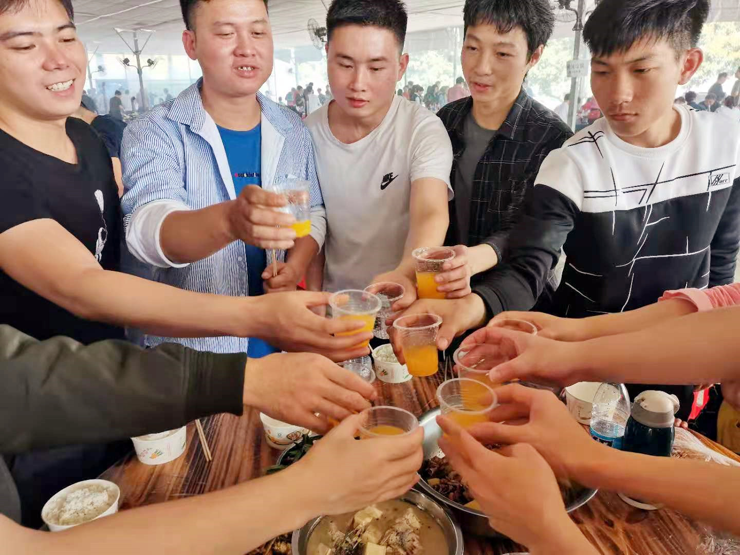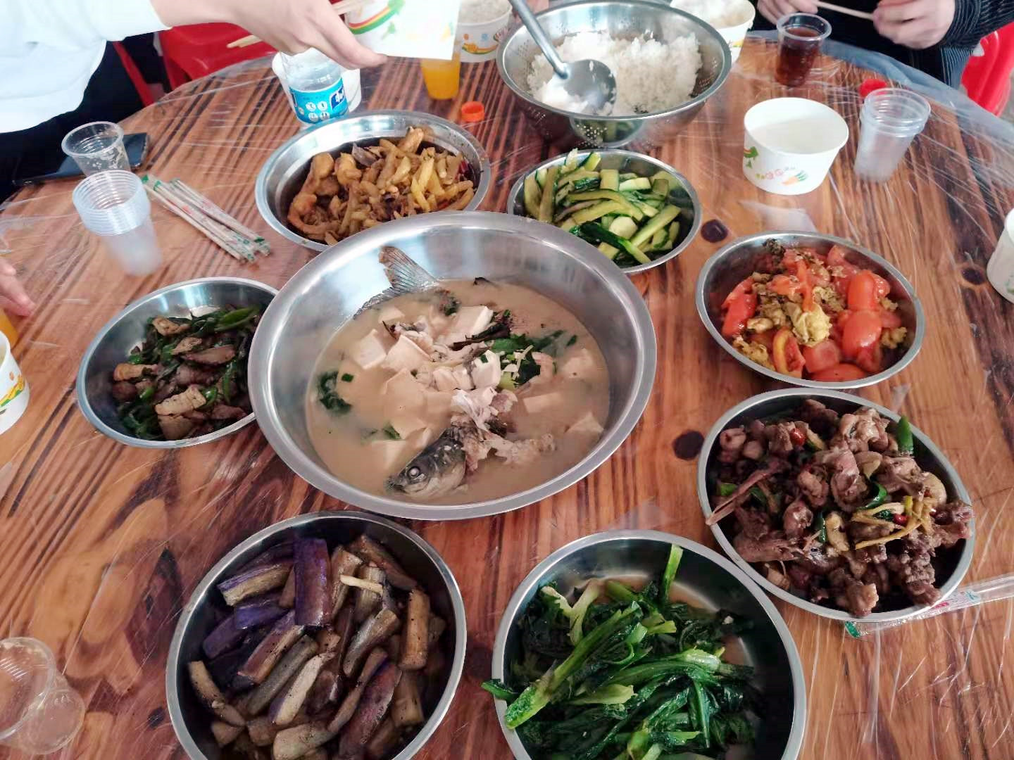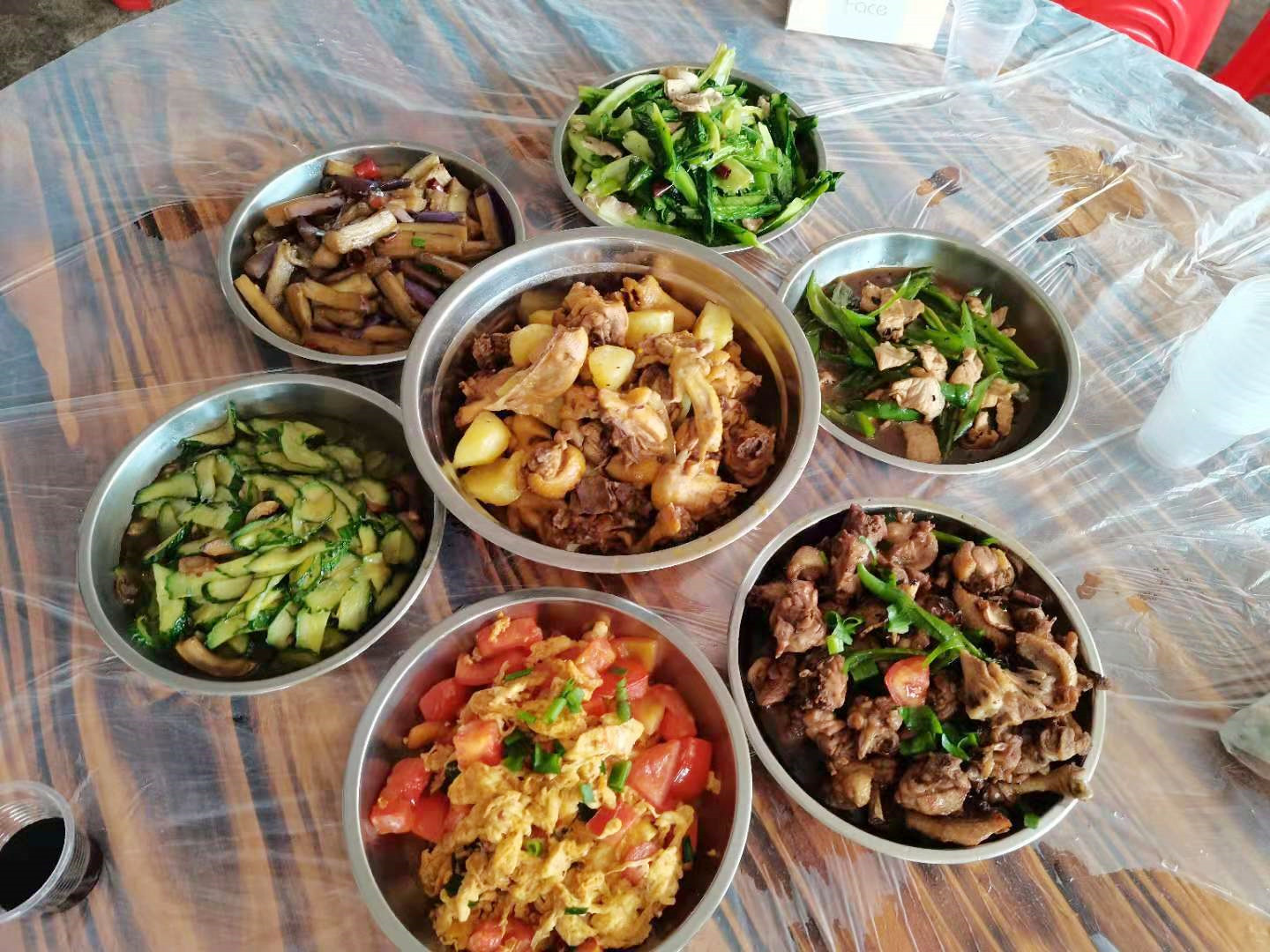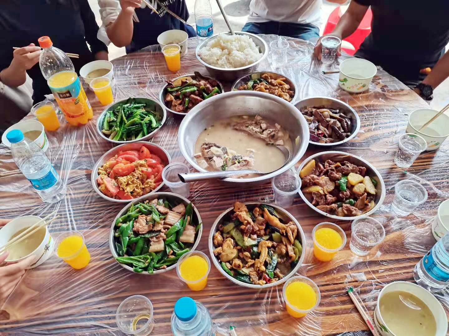 在炊煙裊裊中,經(jīng)過一個半小時的“奮戰(zhàn)”,一道道美味佳肴呈上“飯桌”香味四溢,令人垂涎三尺。大家先拍照留念,然后再一起舉杯,祝大家開心快樂,事事順利!