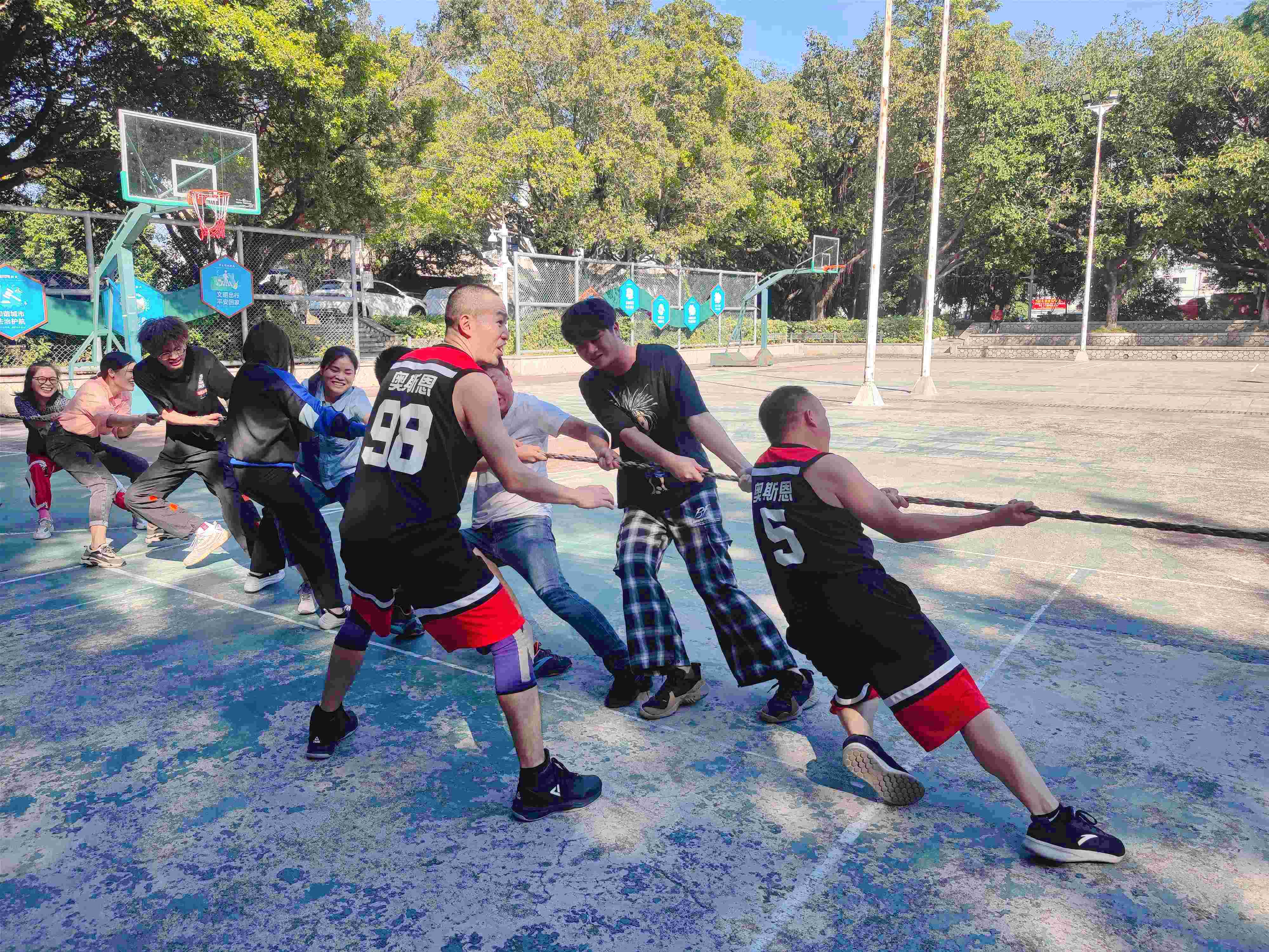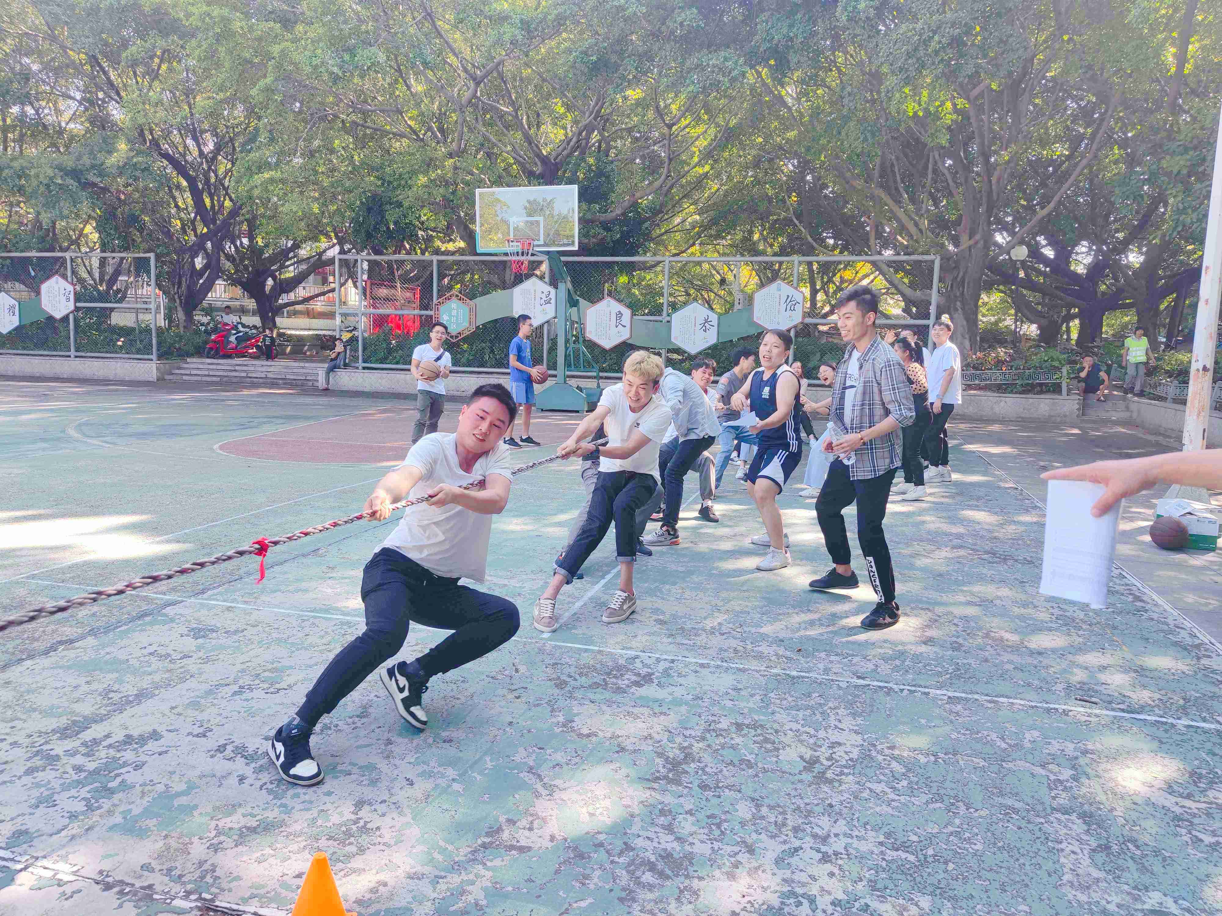中午經(jīng)過短暫的休息補充體力后,下午接著開展拔河比賽,平日里積累的脂肪終于要派上戰(zhàn)場了,拔河除了力氣還有很多技巧講究,比如站位、姿勢、喊口號統(tǒng)一發(fā)力等等,因為本次運動會采取的是團(tuán)隊積分賽制,所以拔河比賽任然在東方和笑傲江湖兩支戰(zhàn)隊中展開,隊長經(jīng)過戰(zhàn)術(shù)安排后,挑選組合出四組選手,開展力量的競爭,隨著裁判員的一聲哨響,雙方隊呼的“指揮員”振臂吶喊,繩子兩頭的“大力士”紛紛往下傾斜,瞧瞧他們的表情,仿佛臉部都在用力呀。