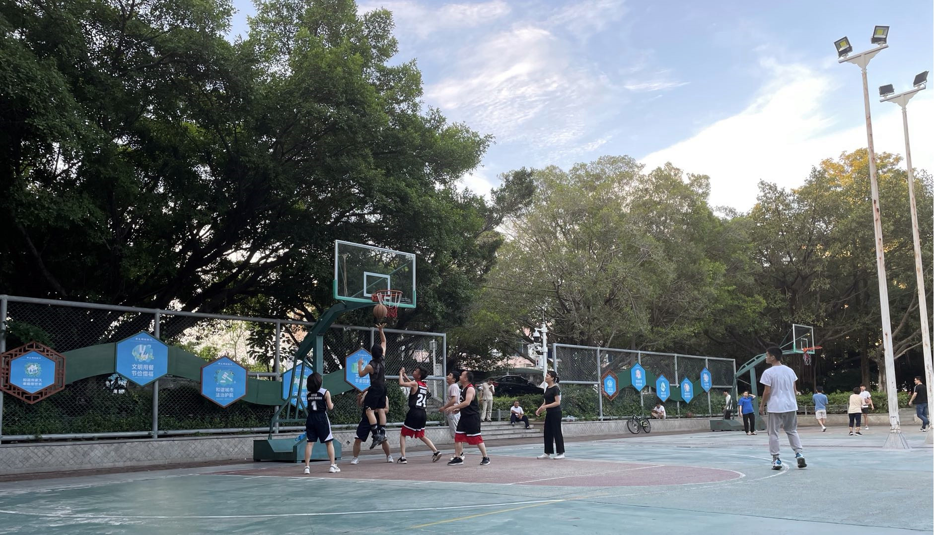 伴隨著哨聲的響起,現(xiàn)場的氣氛極具攀升,各隊(duì)員很快進(jìn)入激烈角逐的狀態(tài),場下的啦啦隊(duì)為他們吶喊助威!女隊(duì)員給男隊(duì)員攔人,男隊(duì)員負(fù)責(zé)帥氣的進(jìn)攻上籃得分,每個(gè)人都雄姿英發(fā),開啟暴走模式,你爭我奪,你攻我守。比賽越是進(jìn)行到尾聲越是精彩,巧妙的傳球、華麗的轉(zhuǎn)身、經(jīng)典的跳投,再加上解說員的渲染解說,更加精彩無比了。