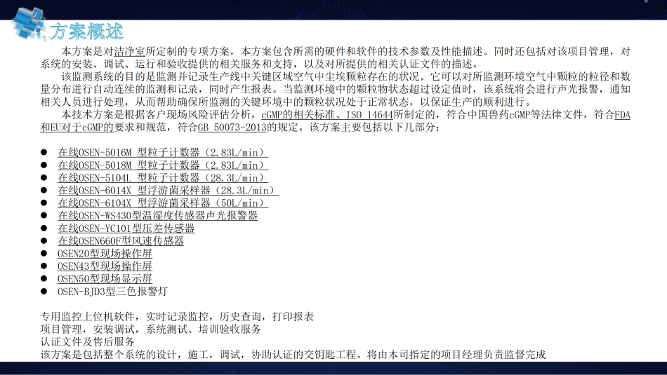 本系統(tǒng)以及定制化服務(wù)能滿足用戶在潔凈室的生產(chǎn)區(qū)域?qū)崿F(xiàn)在線粒子連續(xù)監(jiān)控的要求,潔凈室的所有采樣點同時監(jiān)測0.5um和5.0um的粒子狀況,符合GB50073-2013、ISO14644、GB/T16292-2010、美國FDA、歐洲EU GMP、及中國現(xiàn)行cGMP的相關(guān)規(guī)定。