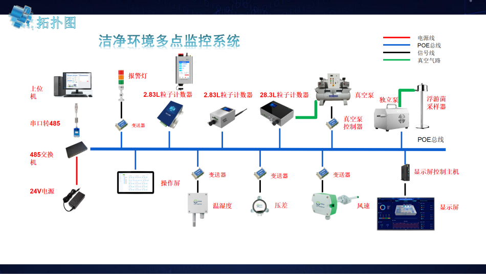 它是將多臺遠(yuǎn)程遙控粒子傳感器安裝在各個所需的采樣點。分別分布在各處的粒子傳感器隨時測量被采樣的空氣,并將測量結(jié)果通過數(shù)據(jù)線和接口傳送到計算機。若配上各類環(huán)境傳感器,通過計算機得到各個測量點的環(huán)境參數(shù)值。這樣一來, 計算機同時可以顯示監(jiān)測點的粒子計數(shù)值,溫濕度和壓差,風(fēng)速值等。