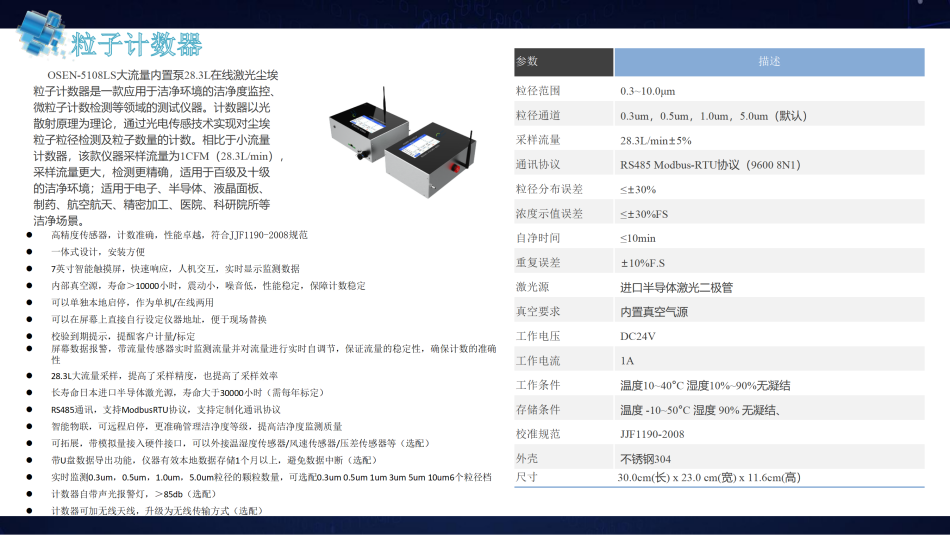 將在線式塵埃粒子計數(shù)器安裝在潔凈室區(qū)域,可避免人為干擾,主控電腦遠(yuǎn)程監(jiān)控各采樣點粒子狀況,監(jiān)測結(jié)果直接傳送到主控電腦,實現(xiàn)在線多點監(jiān)測、遠(yuǎn)程集中控制管理,大幅度提高了潔凈空間的監(jiān)測質(zhì)量和水平,是藥品生產(chǎn)進(jìn)行全面貫徹 GMP 規(guī)范所必需的環(huán)境監(jiān)測設(shè)備,是電子廠、醫(yī)院手術(shù)室、航空航天、精密加工、食品行業(yè)等潔凈場景提高生產(chǎn)環(huán)境監(jiān)控質(zhì)量從而提高產(chǎn)品良品率的必備儀器,計數(shù)器計數(shù)效率及準(zhǔn)確度符合國家計量總局頒布的JJF1190-2008《塵埃粒子計數(shù)器校準(zhǔn)規(guī)范》規(guī)程的技術(shù)要求。