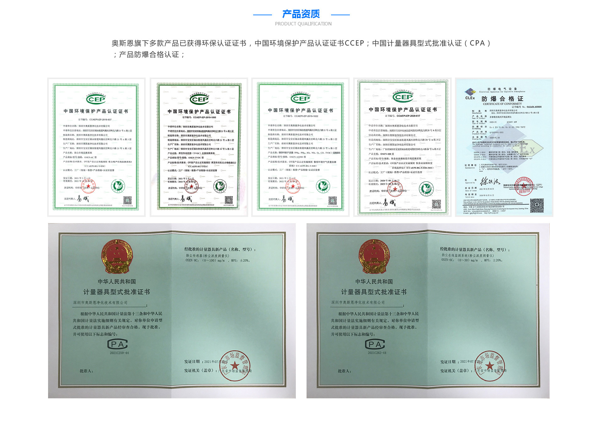 奧斯恩通過CPA、CCEP、防爆認(rèn)證、CNAS檢測認(rèn)證等近百項行業(yè)資質(zhì)認(rèn)證