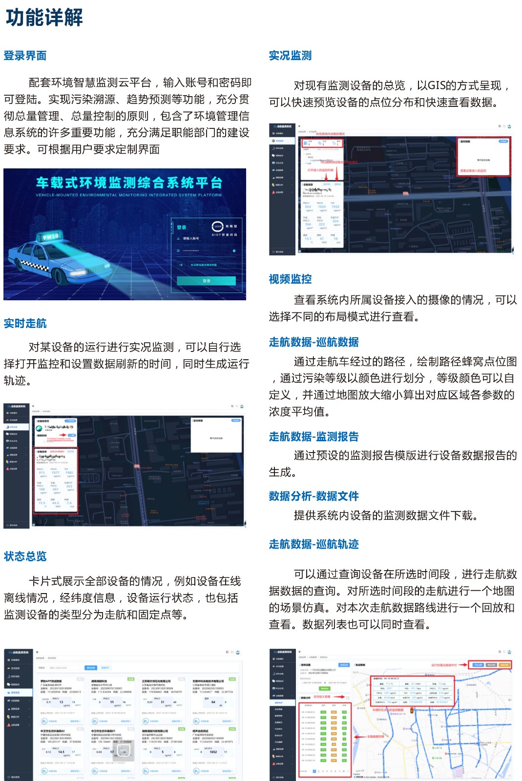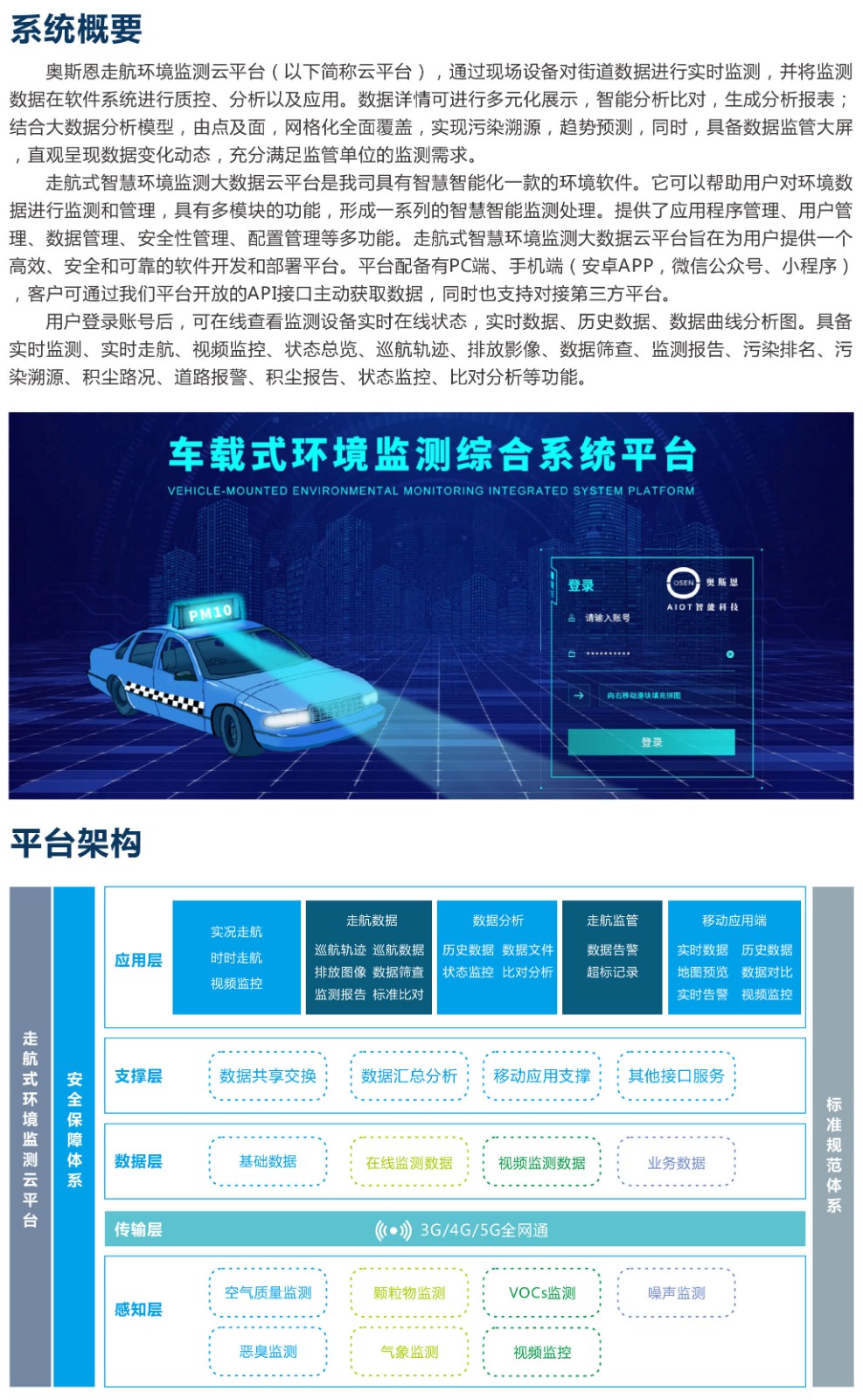 奧斯恩走航式空氣質(zhì)量監(jiān)測(cè)大數(shù)據(jù)平臺(tái),巡航軌跡線路圖,走航數(shù)據(jù)分布圖可視化展現(xiàn),平臺(tái)自帶分析報(bào)告模板,自動(dòng)生成分析報(bào)告,多種數(shù)據(jù)報(bào)表下載,可后臺(tái)參數(shù)配置,為大氣污染溯源和治理提供數(shù)據(jù)支撐、數(shù)據(jù)分析和決策依據(jù)。用戶可通過PC端和手機(jī)端登錄查詢。提供API接口,同時(shí)支持對(duì)接第三方平臺(tái),支持二次開發(fā)升級(jí),部署方式靈活多樣。應(yīng)用于出租車走航監(jiān)測(cè),公交車走航監(jiān)測(cè),巡邏車走航監(jiān)測(cè),移動(dòng)式走航監(jiān)測(cè)場(chǎng)景。